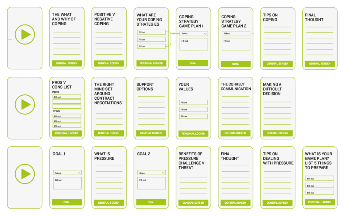 Working closely with the stakeholder team on a psychology lead approach to a wellness program. Based on proven cycles we created a user friendly staged interface to relay the information in a simple and engaging way by mapping the various user flows and inserting goals and other features to allow for a simple navigation through the key pieces of information.