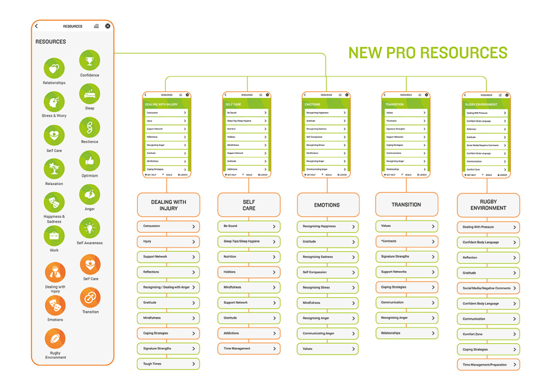 While Creative Director at izest I worked on the brand development, User Experience and Interface and end to end production needs with Rugby Players Ireland. The App is a mental well-being app, based on sports psychology and positive psychology principles, which aim to help people develop their self-awareness and improve their mental well-being. Users are guided through a ‘Training Camp’ programme to help them work on specific areas like Confidence, Satisfaction and Resilience.